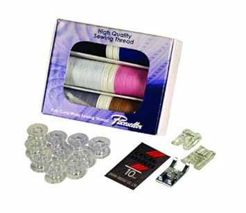 Brother helps new sewing enthusiasts get set up for success with this handy starter kit. Included are six spools of colored 40-weight polyester thread specifically designed for Brother sewing machines, 10 Organ Brother OEM sewing needles, 10 Brother OEM empty bobbins, 1 clear view accessory foot, 1 pearl and sequins foot, and 1 cording accessory foot. This value-set also makes a great companion gift with a sewing machine.